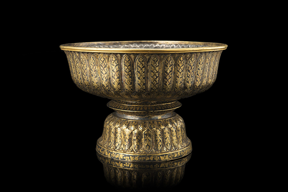 Lot 286 | Coppa in metallo sbalzato e dorato, decorata a palmette e motivi fogliati....