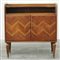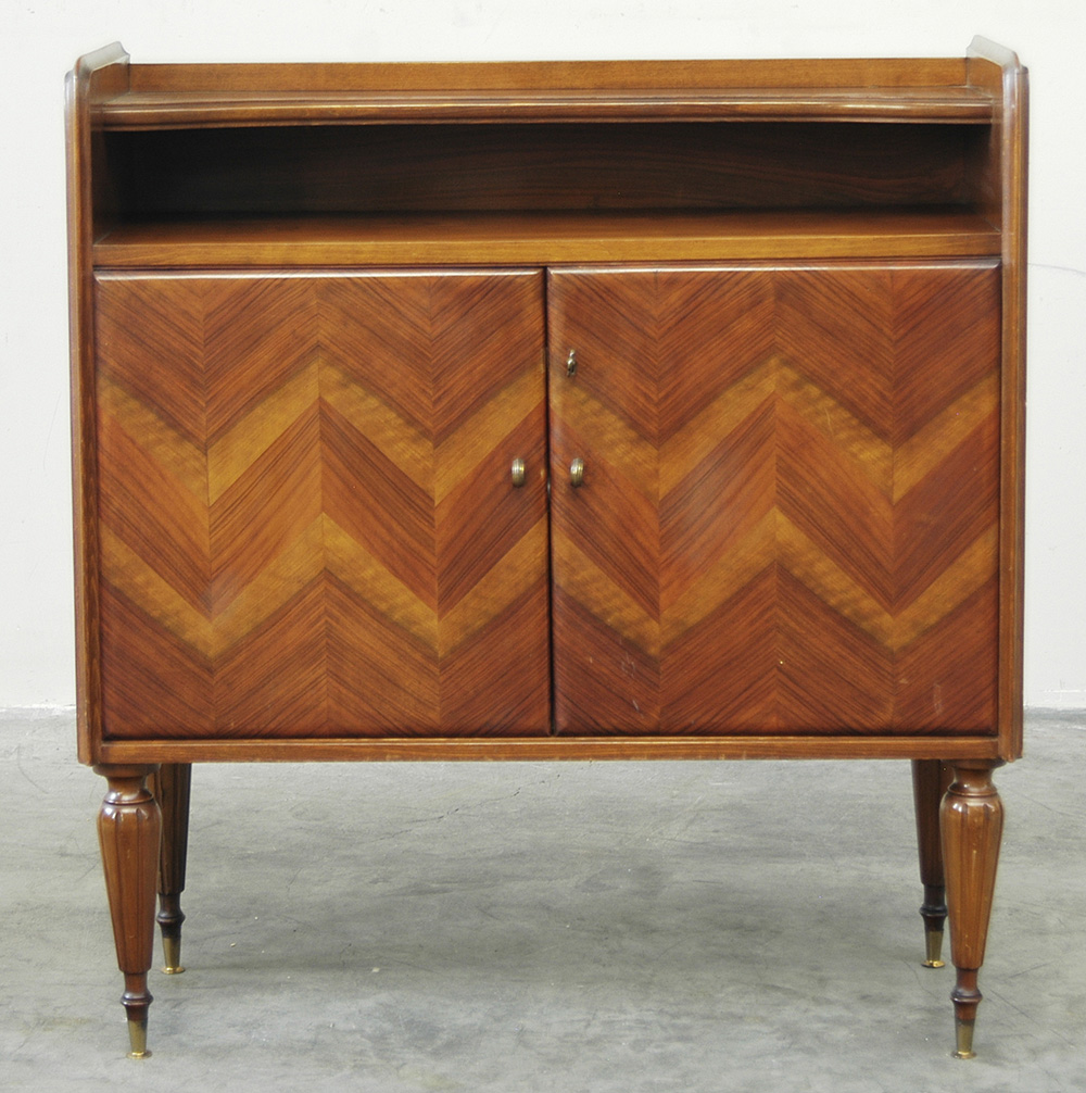 Mobile secretaire in noce a due ante lastronate e due ripiani superiori, gambe a balaustra scanalata con puntale in ottone. Esecuzione italiana anni '50 del sec XX (104x112x37)