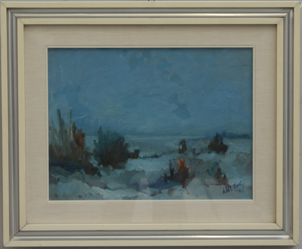 Firma indecifrata, "Nel fiume Taro...", 1972. Olio su tela (cm 29x40).Firmato e datato in basso a destra e dal verso. In cornice.