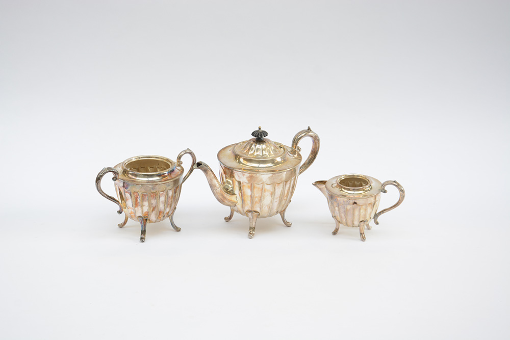 Servizio da tË in metallo argentato costolato composto da teiera, lattiera e zuccheriera (difetti e mancanze)