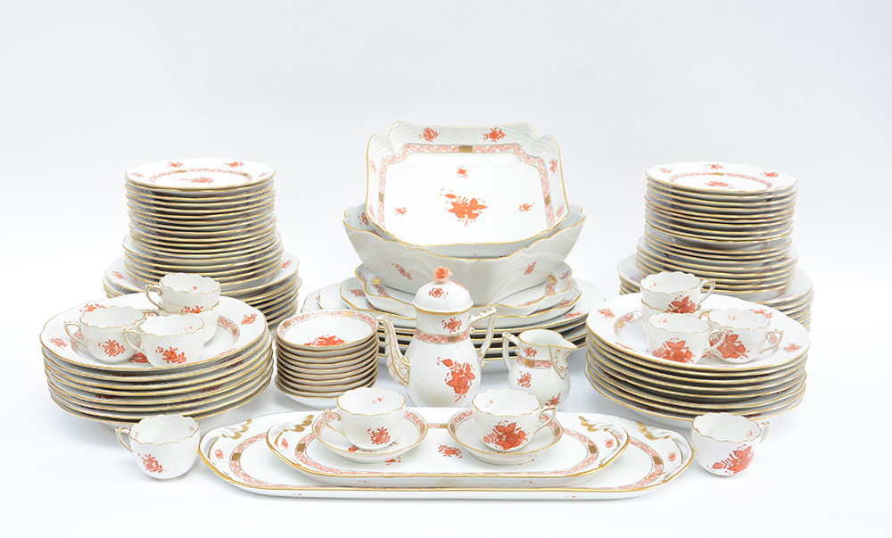 Manifattura di Herend. Parte di servizio in porcellana mistilineo e sagomato decorato con dorature, motivi a nastro e intreccio di vimini e bouquet di fiori color rosso arancio composto da: due insalatiere, sette piatti da portata di misure diverse, sedici piatti piani (cinque con decoro color violetto), sedici piatti fondi (cinque con decoro color violetto, uno diverso), trentasei piattini da dessert di misure diverse, due vassoi biansati, dodici tazzine da caffË con piattini, una caffettiera e una lattiera.