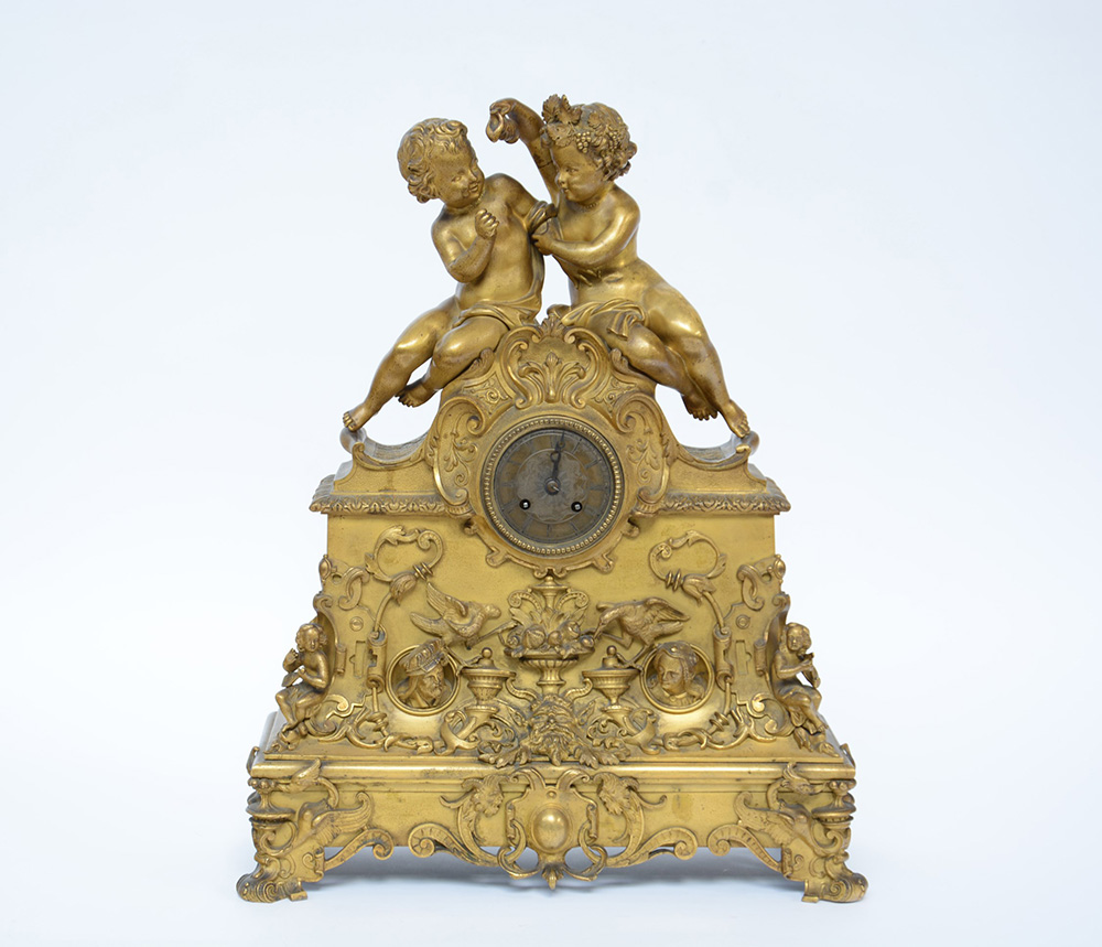 Pendola da camino in bronzo dorato con figure in altorilievo sormontata da una coppia di putti giocosi a tutto tondo. Quadrante argentato con cifre romane, carica settimanale delle ore e delle mezze, sospensione a filo. Epoca 1850-1870 ca (mancante della chiave, difetti)
