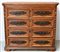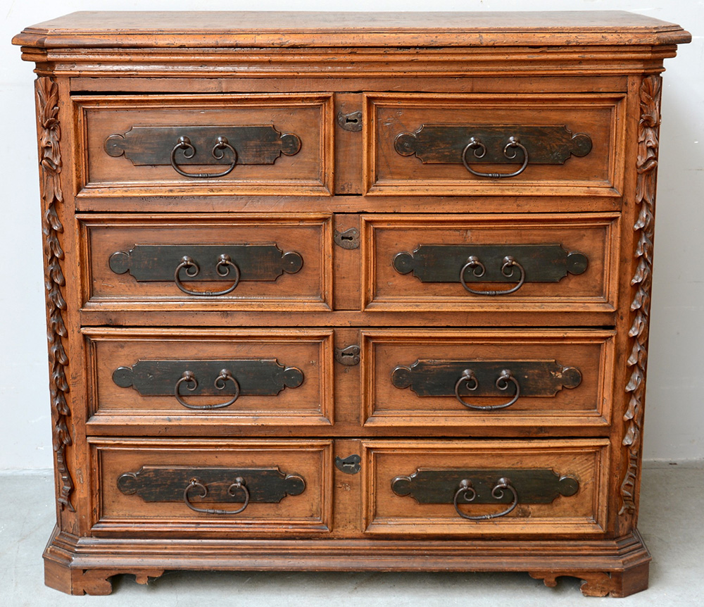 Canterano in noce a quattro cassetti riquadrati e pannellati con montanti intagliati a mascheroni e motivi vegetali. Piedi a mensola. Sec. XVII (cm 127x112x63) (difetti e restauri)