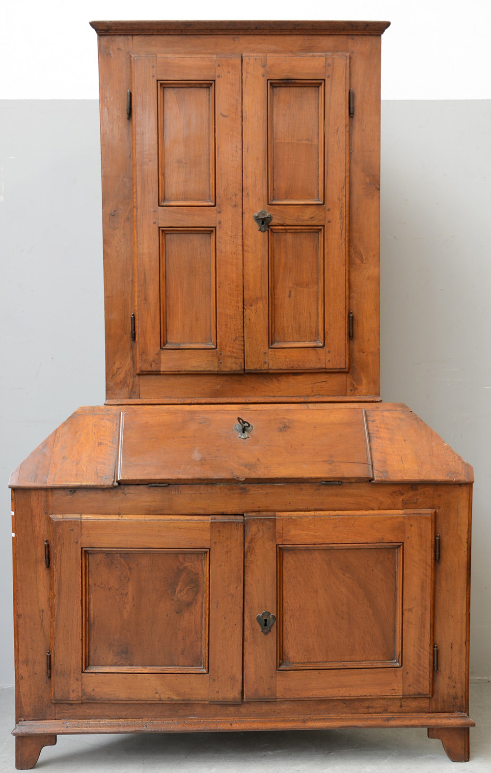Cantonale a due corpi in noce, parte superiore a due ante riquadrate e parte inferiore con anta ribaltabile, celante all'interno cassetto e vano. Due sportelli sul fronte e piedi sagomati. Fine sec. XVIII (cm 135x220x76)(difetti e restauri)