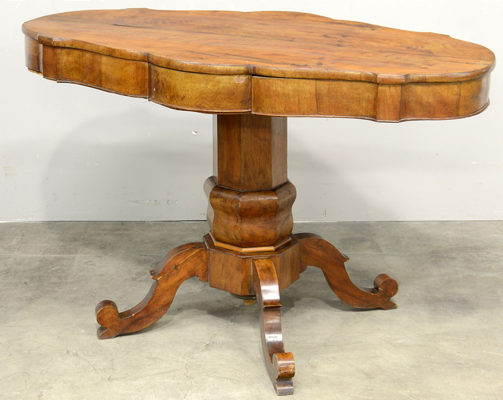 Tavolo di forma sagomata lastronato in noce a due cassetti nella fascia, gamba centrale sfaccettata terminante a quattro piedi sagomati. Sec. XIX (cm 130x82x74)(difetti)