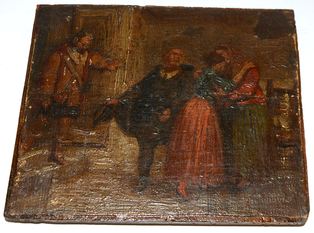 Ignoto, sec. XIX "Scena d'interno" piccolo dipinto ad olio applicato su tavoletta (cm 13x16)