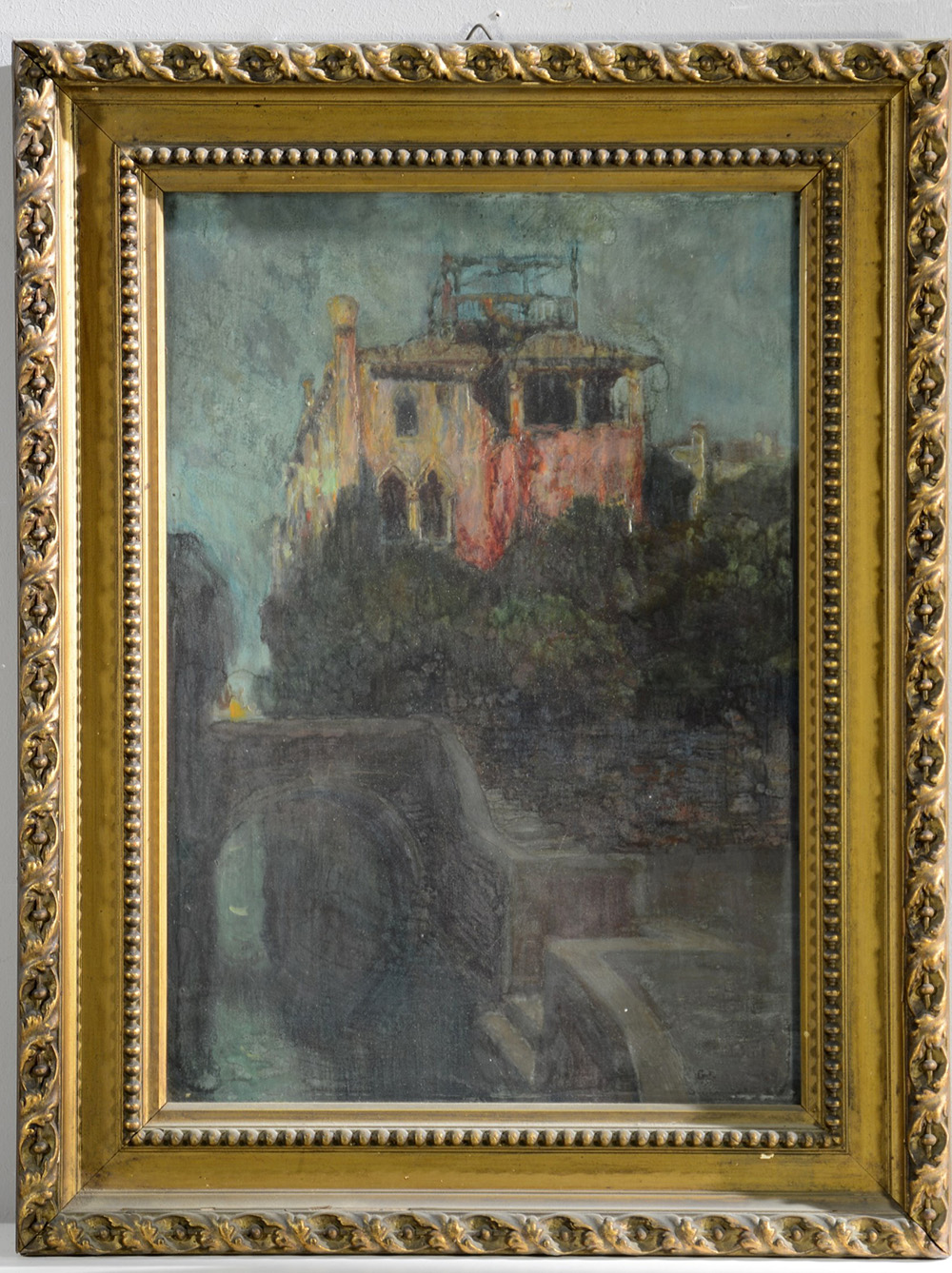G.L Sormani "Scorcio di palazzo" olio su compensato (cm 43x20). Tracce di firma in basso a destra e iscritto e datato 1917 al retro. In cornice