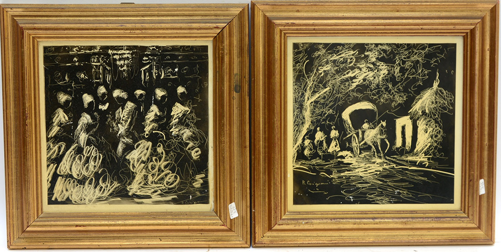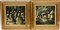 Coppia di piastrelle in ceramica raffiguranti scena d'interno e paesaggio. In cornici