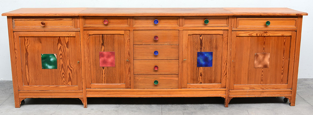 Grande credenza da cucina a quattro ante con quattro cassetti nella colonna centrale e cinque sottopiano. Maniglie e formelle in rame smaltato attribuibili alla manifattura di Paolo De Poli (cm 291x78x53) (difetti)