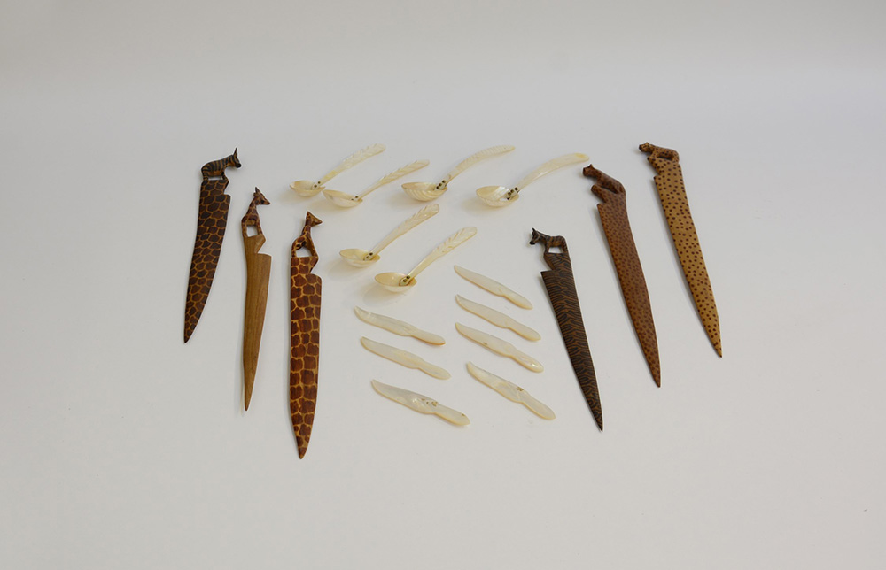 Scatola contenente tredici posate in madre perla di diversa forma e sei tagliacarte di artigianato africano.