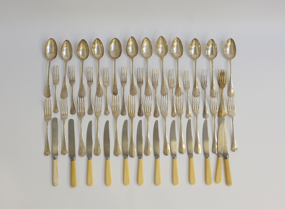 Lotto composto da dodici coltelli, ventiquattro forchette, dodici cucchiai in metallo argentato di diversa forma e decoro.
