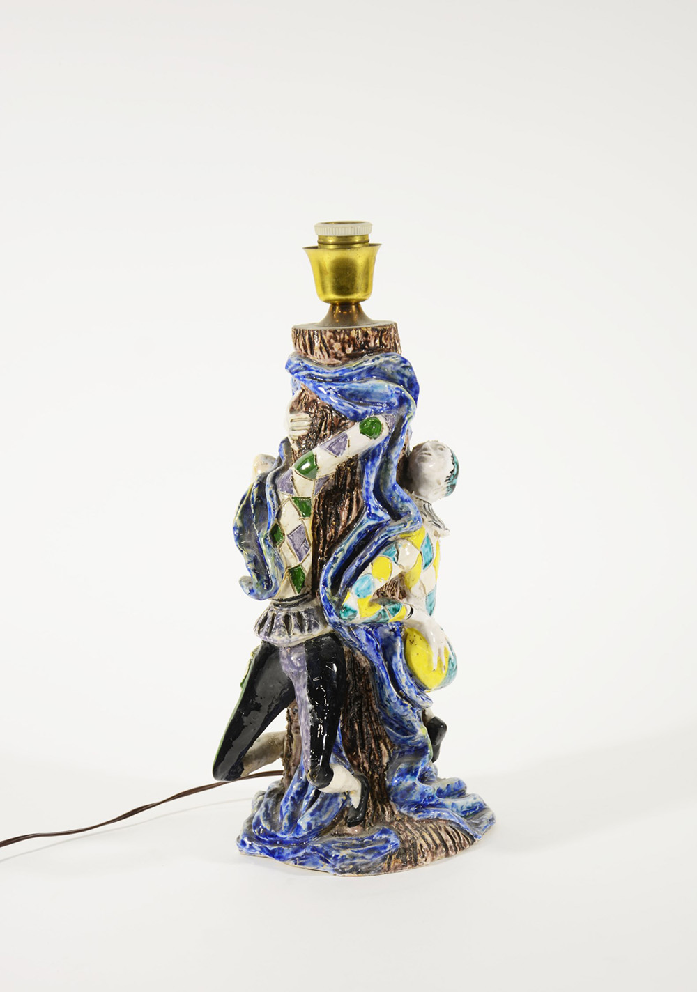 Manifattura Ceramiche Bristotti Lampada a una luce in ceramica policroma raffigurante due giullari abbracciati ad un tronco. Modello di Toti-Cattadori (h cm 40) (difetti e restauri)