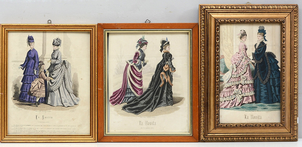 Lotto di tre incisioni acquerellate del secolo XIX raffiguranti la moda femminile, in cornici (difetti)