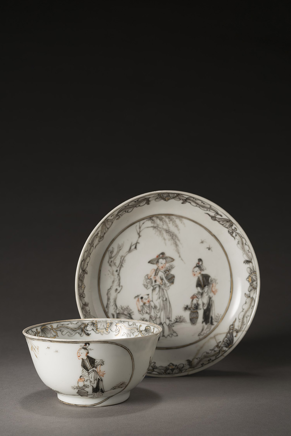 Piccola ciotolina e piattino in porcellana con decoro en grisaille di figure in paesaggio (difetti) Cina, sec. XVIII (piattino diam. cm 12)