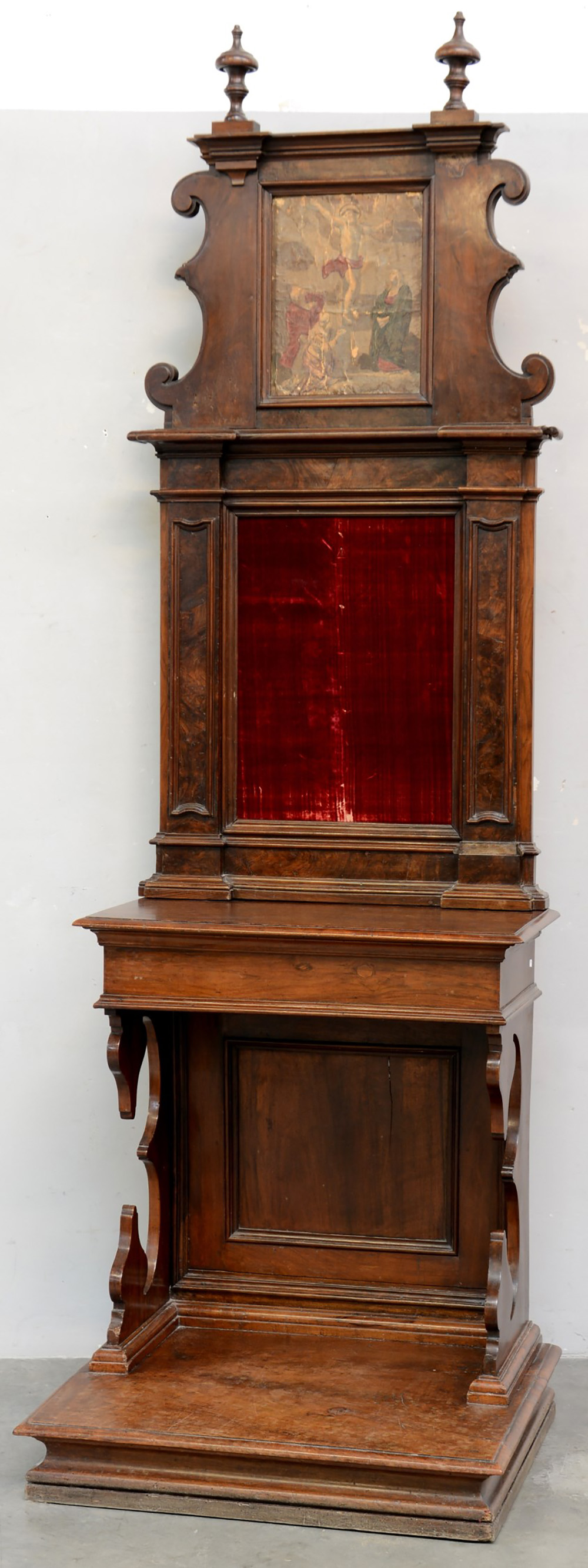 Lot 457 | Inginocchiatoio da sagrestia con montanti sagomati e doppia alzata sormontata...