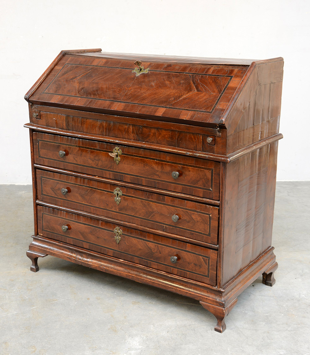 Antica ribalta in noce, lastronata in radica e filettata. Fronte a tre cassetti con due tiretti laterali, anta ribaltabile e cassettini interni (cm 102x107x54) (difetti)