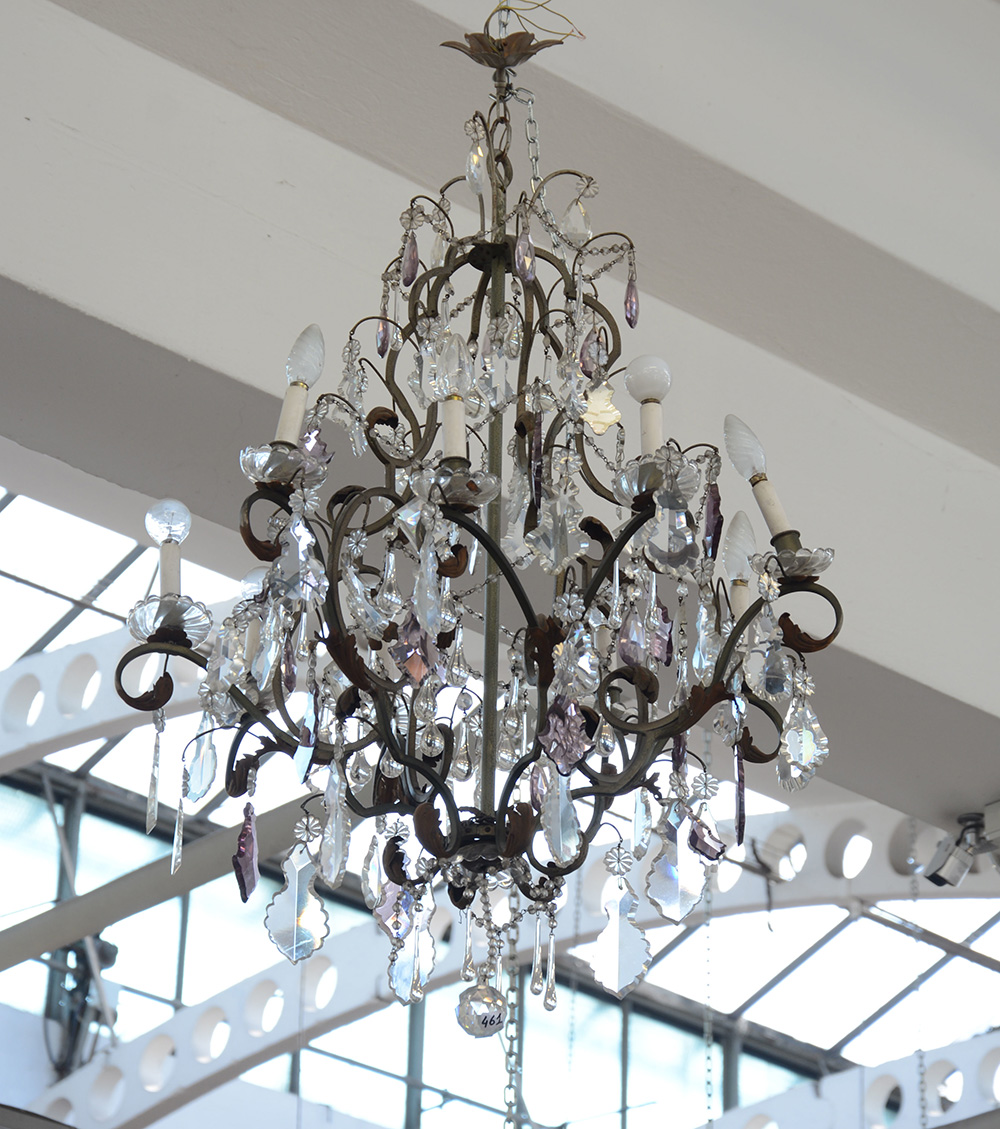 Lampadario a nove luci con struttura in ferro battuto a volute e piccole foglie, pendagli a goccia in cristallo (h cm 80) (difetti e mancanze)