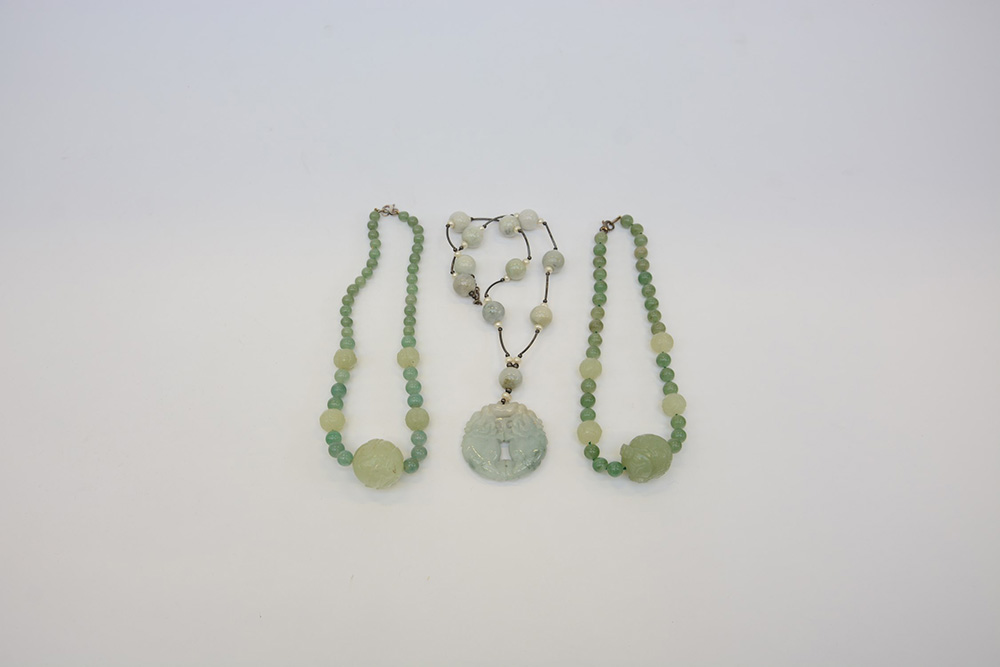 Lot 489 | Tre collane in giada verde e nefrite con pendenti scolpiti Cina, sec. XX...
