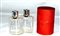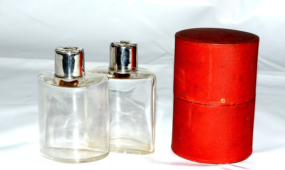 Coppia di flaconi portaprofumo semicilindrici in vetro e con tappo in argento decorato da fiore. Italia, sec. XX. In custodia (lievi difetti)