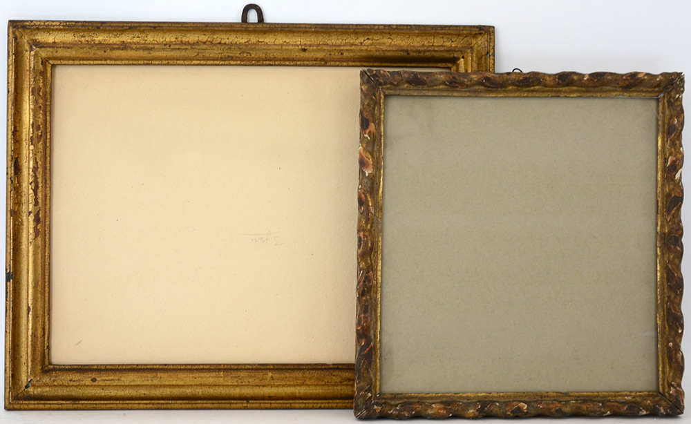 Lotto di due cornici in legno dorato, di cui una con profilo a torchon (luci cm 35,5x47 e 34x32) (difetti)