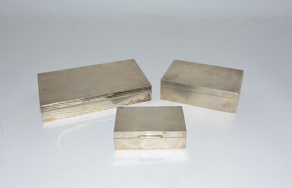 Lotto di tre scatole in argento e legno di forma rettangolare (difetti)