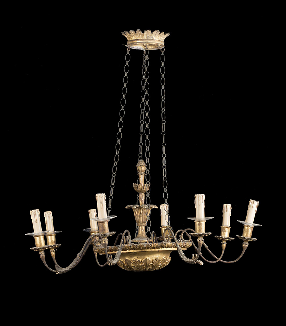 Lampadario a otto fiamme in legno dorato e intagliato a palmette a motivi vegetali, braccia in ferro. Sec. XIX (difetti e mancanze)