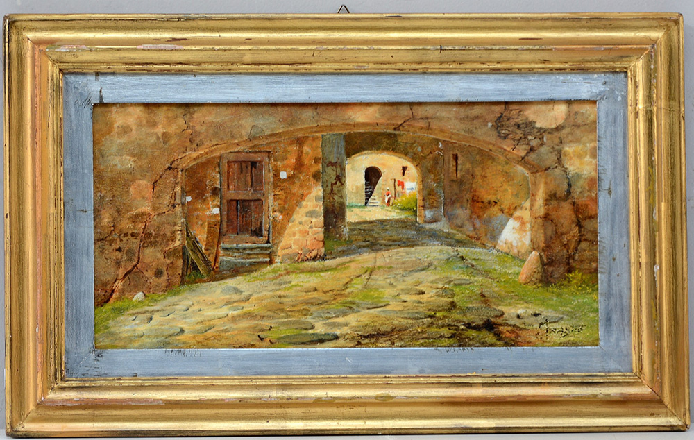 Mirabito "Portico" olio su tela (cm 19x38) firmato in basso a destra, iscritto e datato al retro, in cornice