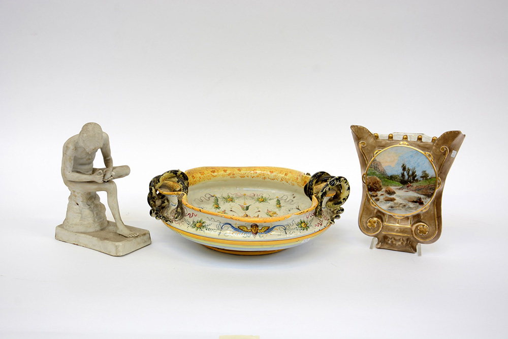 Lotto composto da un centrotavola, una fioriera da parete e una statuetta in ceramica policroma e bisquit (difetti e mancanze)