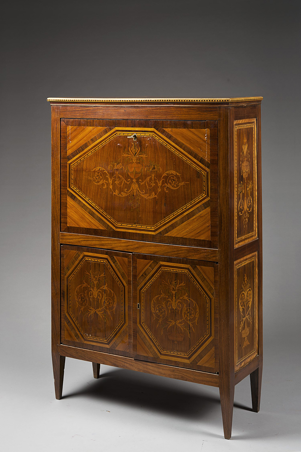 Secretaire in noce e radica con fronte ad un'anta ribaltabile celante vani e cassettini e due ante nella base. Intarsiato e filettato a volute fogliate e vasi fioriti. Fianchi decorati a motivi vegetali e fiori. Lombardia, sec. XVIII (cm 102x19x40) (difetti e restauri) 18th-century Lombard walnut secretaire (defects and restorations)