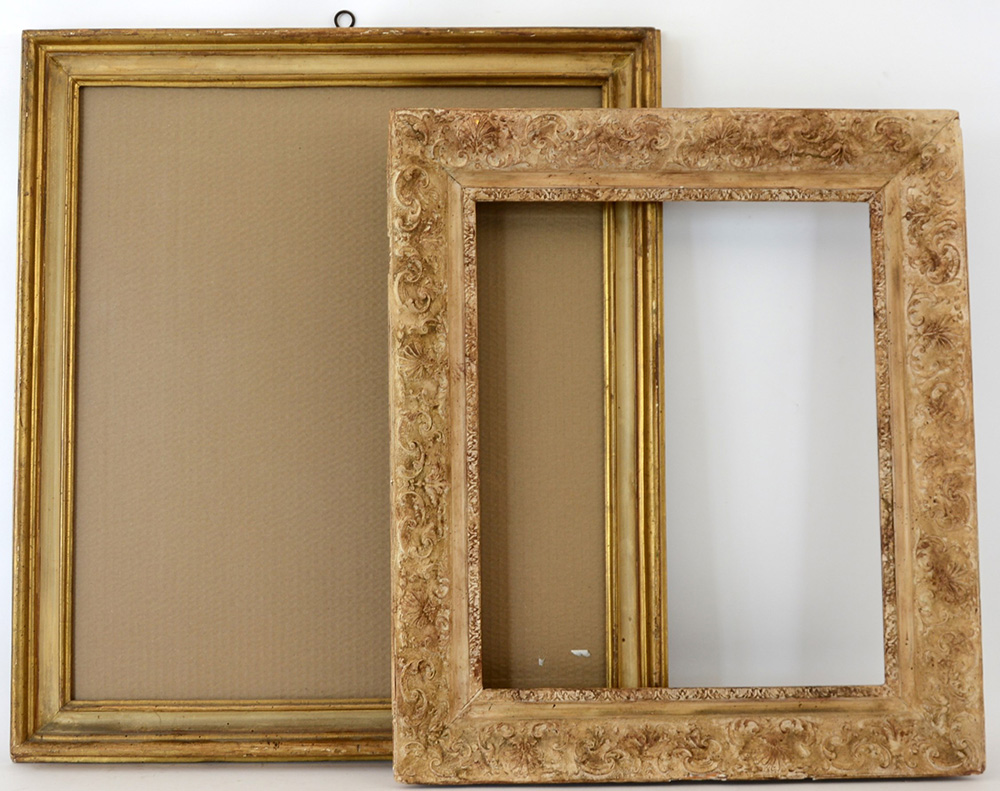 Lotto di due cornici in legno laccato di fatture differenti (luci cm 51x60 e 38,5x46,5) (difetti)