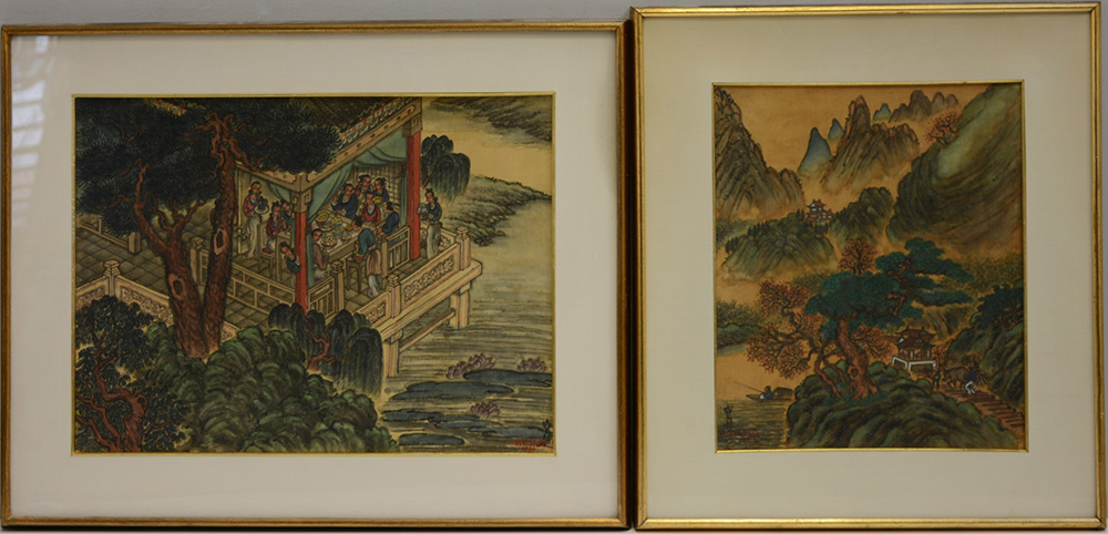 Shen "Paesaggi giapponesi con figure" lotto composto da due dipinti su tessuto di misure diverse, firmati. In cornici