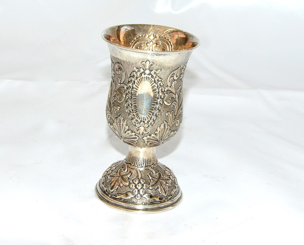 Coppa in argento con piede conico e corpo a balaustro, sbalzato a motivi floreali su sfondo zigrinato e cartiglio coronato e leoni. Italia, met‡ sec. XX (h. cm 14,5) (gr 190 ca) (lievi difetti)
