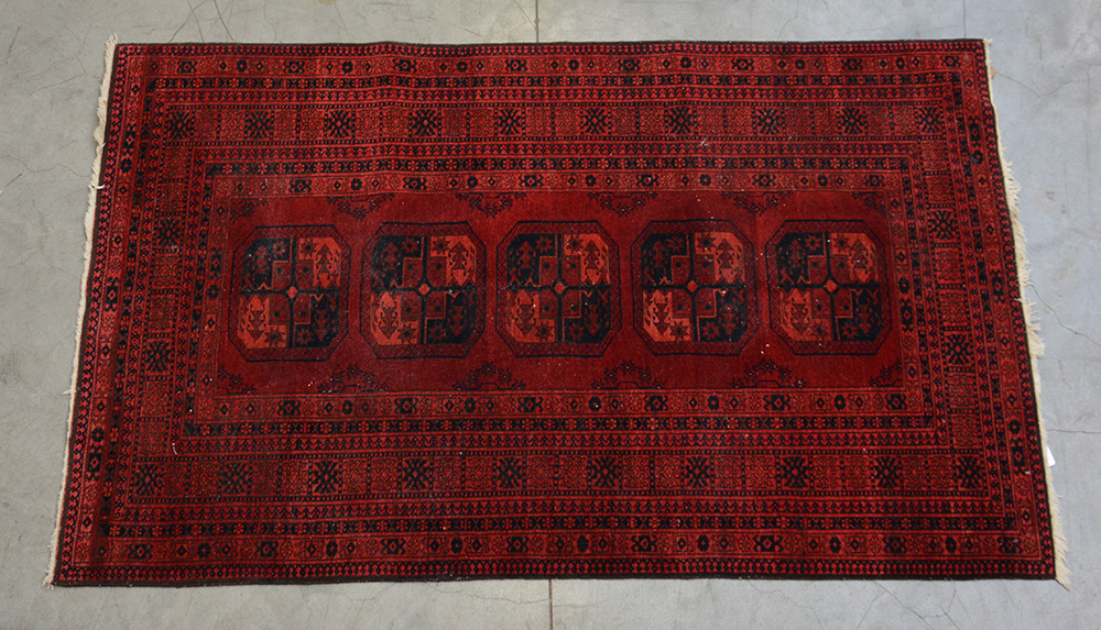 Tappeto Boukhara, Turkestan occidentale sec. XX. Disegno a cinque Gul su fondo rosso (cm 195x122)(difetti)