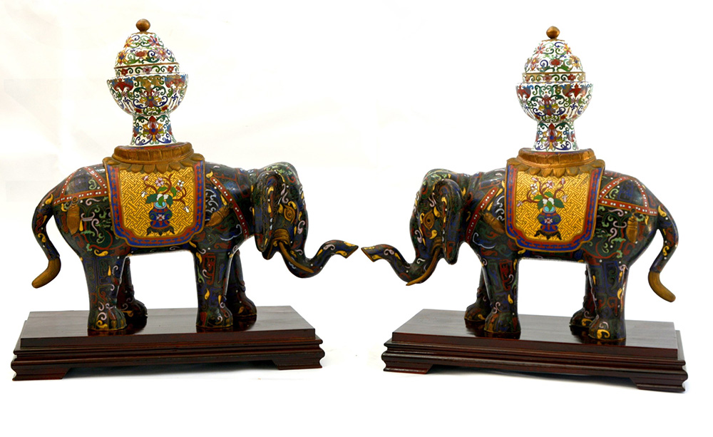 Coppia di bracieri a forma di elefante in metallo cloisonne decorato con motivi geometrici su fondo nero, con selle e basi in legno Cina, se. XX (l 49 cm.)