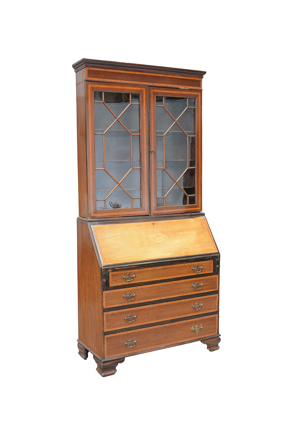 Mobile vetrina composto da due corpi, parte inferiore a quattro cassetti e ribalta celante cassettini e vani porta fogli, parte superiore a due battenti con vetrine riquadrate (cm 90x200x40) (difetti e mancanze)