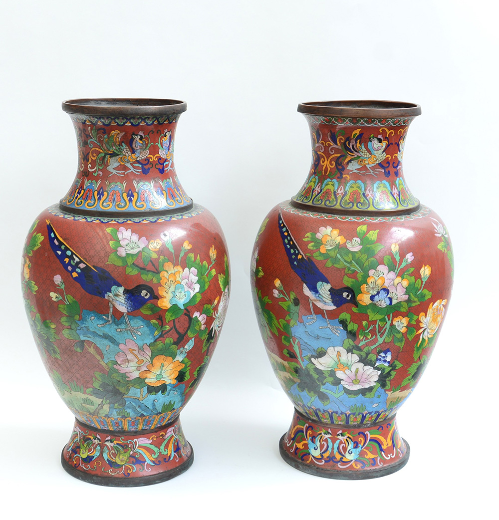 Coppia di vasi cloisonnÈ decorati con volatili tra rami in fiore su fondo rosso con creature fantastiche su fondo turchese (difetti) Cina, sec. XX (h. 66 cm.)