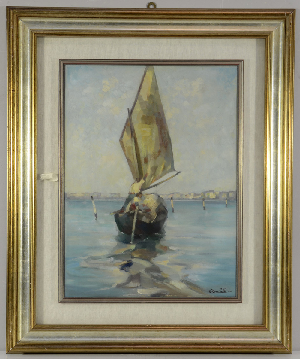 Zambelli "Marina con vela" 1920, olio su tela (cm 60x45) firmato e datato in basso a destra. In cornice