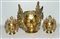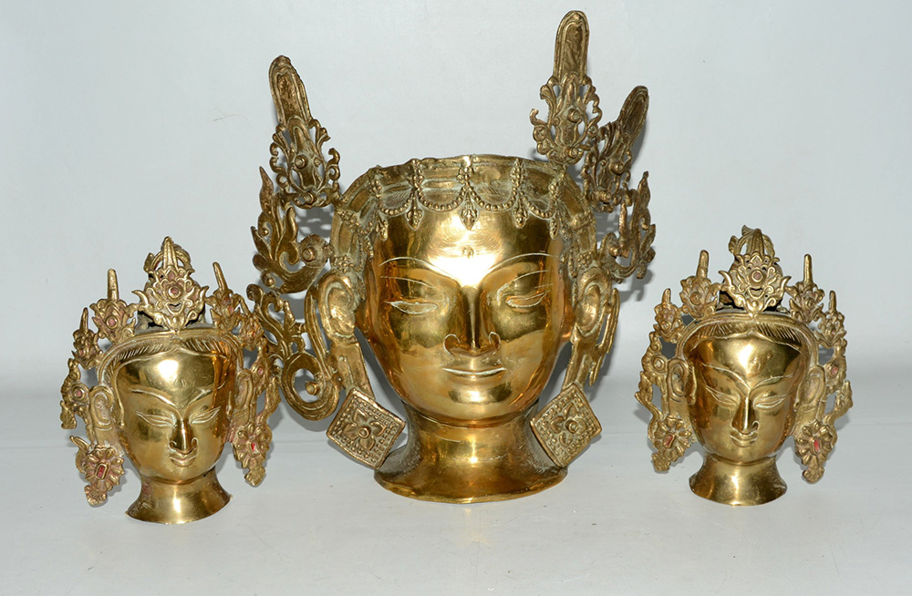 Tre teste di Bodhisattva in metallo dorato. Nepal, sec. XX (h max 31 cm) (mancanze)