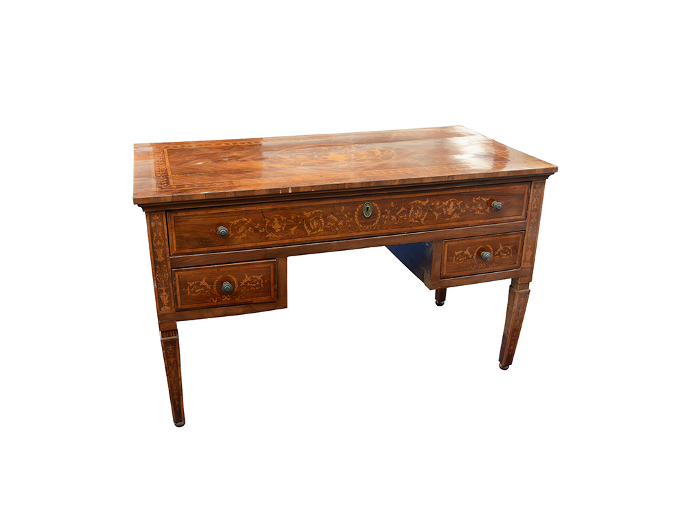 Scrivania da centro in radica di noce, il piano ed i cassetti intarsiati in legno chiaro a girali di foglie e fiori, un cassetto nella fascia e altri due tiretti, gambe troncoconiche. Sec. XVIII (cm 68,5x80x134) (difetti e piccole mancanze)
