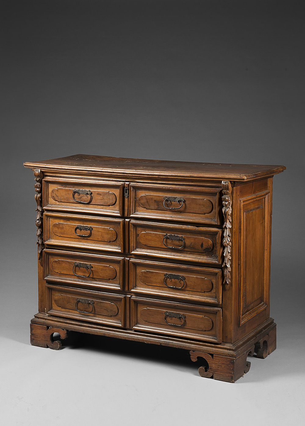 Canterano in noce a quattro cassetti pannellati, il primo a calatoia con cassettini interni riquadrati da sagome, montanti intagliati a teste di cherubini e motivi vegetali. Fianchi con pannelli scolpiti nel massello. Piedi a mensola. Lombardia, sec. XVII (cm 138x108x63) (difetti e restauri)