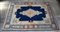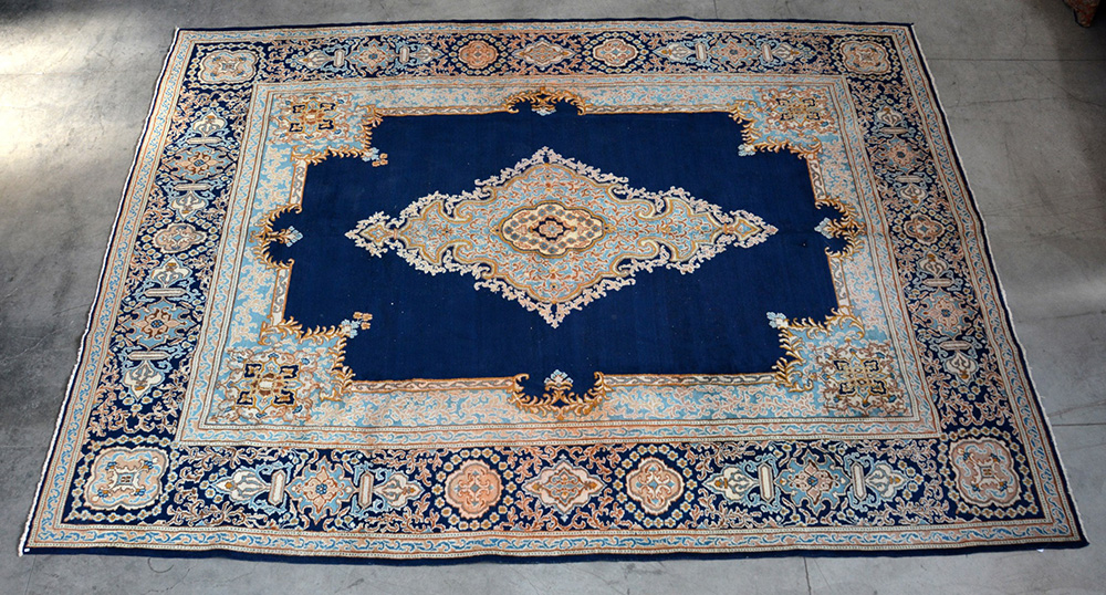 Tappeto rumeno con disegno korani secolo XX. Disegno a medaglione azzurro e bianco su fondo blu (cm 411x292) (difetti)