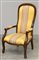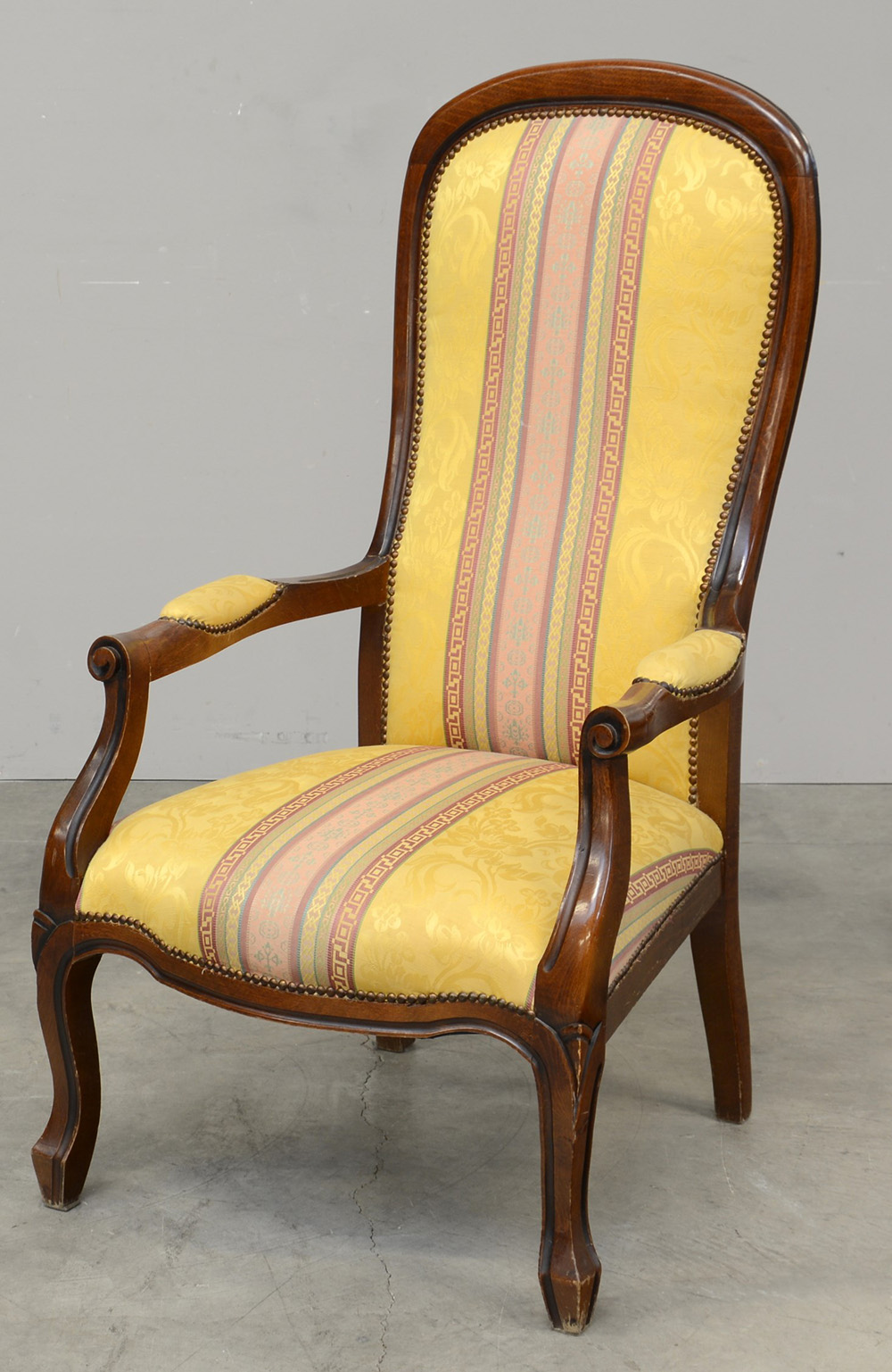 Poltrona con schienale sagomato, braccioli, montanti e gambe mosse ricoperta con tessuto giallo