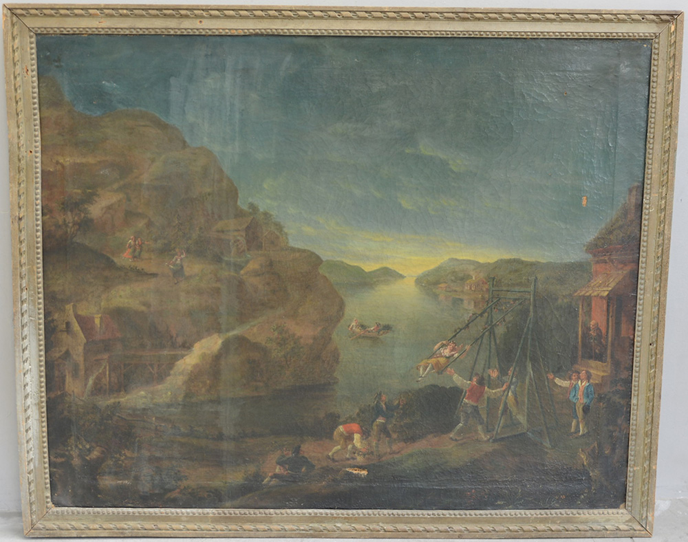 * Ignoto "Paesaggio bucolico con figure" olio su tela (cm 84x106) In cornice (difetti e restauri)