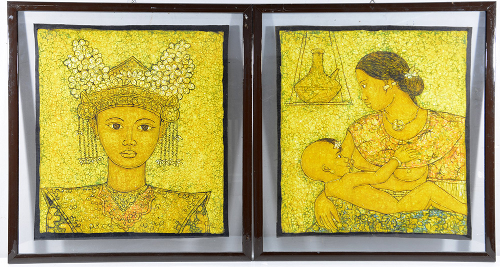 Coppia di opere su tessuto decorate in stile etnico (cm 50x46). In cornici (lievi difetti)