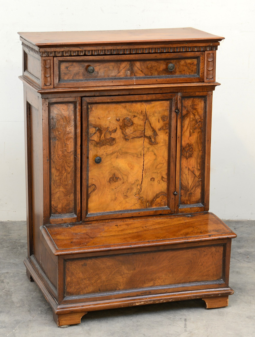 Inginocchiatoio in noce con fronte radicato ad un cassetto e un'anta. Profili unghiati. Sec. XVII (cm 65x88x50) (difetti e restauri)