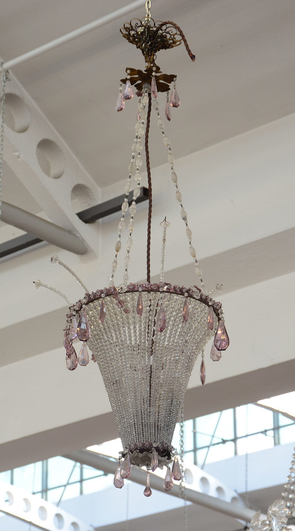Lampadario a forma di cesto decorato a perlinature e gocce policrome (difetti)