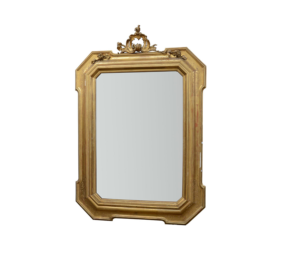 Specchiera rettangolare in legno dorato e bulinato con cimasa intagliata e traforata a motivi vegetali, fiori e volute, sec. XIX (difetti e mancanze)(cm 196x130)