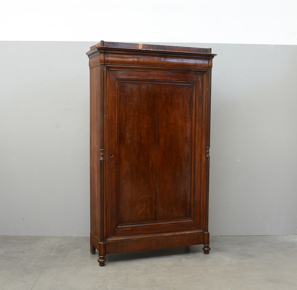 Armadio in noce ad un'anta riquadrata sul fronte con montanti torniti a colonna scanalata. Piedi a cipolla. Sec. XIX (cm 106x192x50)(difetti)