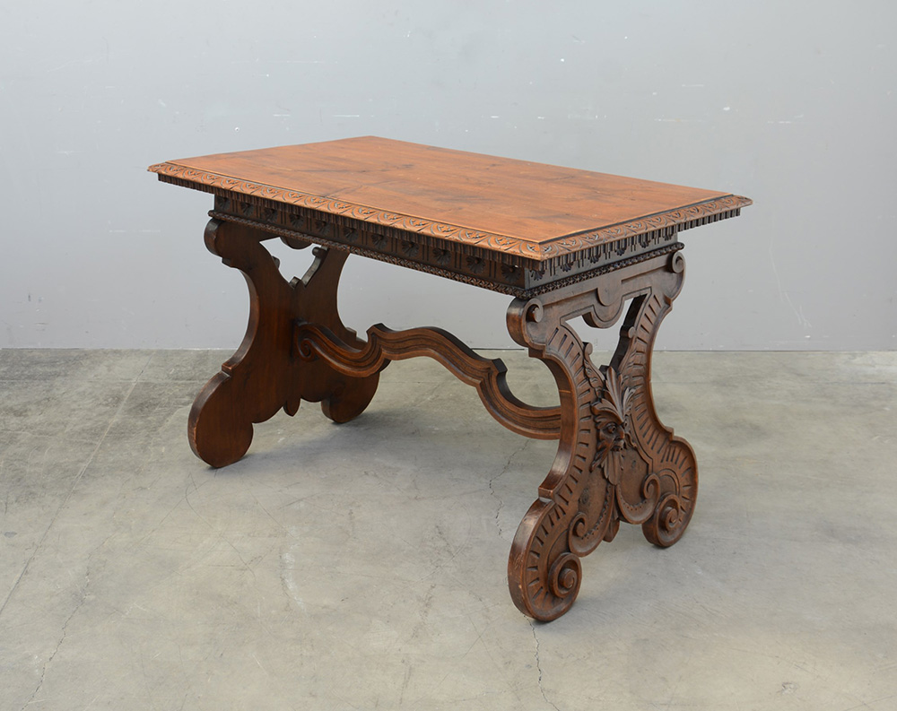 Tavolo rettangolare in noce con gambe sagomate, traforate e intagliate con mascherone e riccioli (cm 120x80x75)