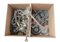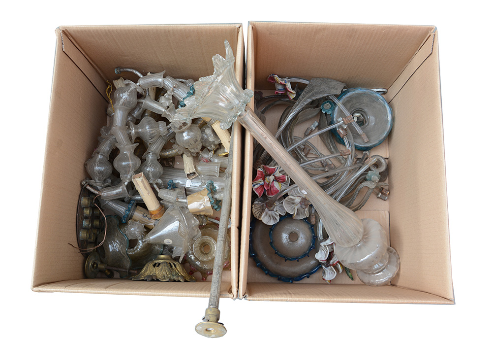Due cartoni contenenti numerose parti di lampadario in vetro policromo (difetti)